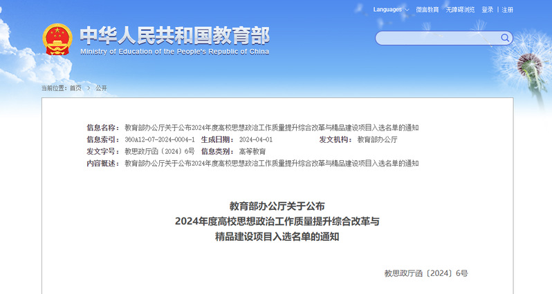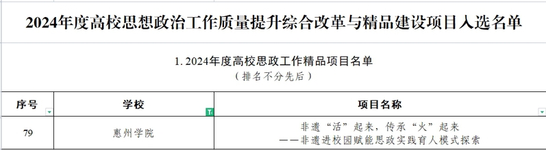 近日,教育部办公厅公布了2024年度高校思想政治工作质量提升综合改革与精品建设项目入选名单,我校项目《非遗“活”起来,传承“火”起来——非遗进校园赋能思政实践育人模式探索》入选高校思政工作精品项目,这是我校首次入选高校思政工作精品项目,实现学校在该项目的历史性突破。